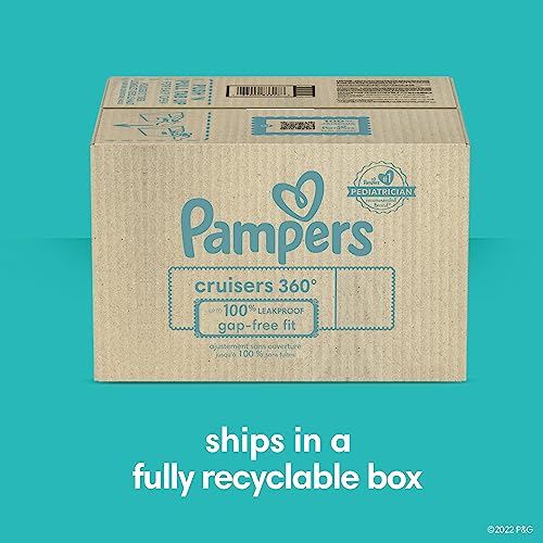 Pampers Cruisers 360 diapers are our best fit and protection for your active baby. Unlike ordinary disposable diapers that gap in the back, Pampers Cruisers 360 diapers stretch comfortably around your baby’s waist and adapt to their every move for a flexible, gap-free fit that is up to 100% leakproof. Plus, they feature our Dual Leak-Guard Barriers that gently seal around your baby’s legs, where leaks happen most. And forget fiddling with ordinary diaper tapes! Pampers Cruisers 360 has a 360-degree stretchy waistband designed to quickly and easily pull up onto your wiggly baby. And when a diaper change is complete, we’ve made disposal simple. All you need to do is RIP the Easy-Tear Sides and ROLL the diaper, then secure it with the disposal tape that comes attached to the back. Simple as that. Also, to keep your baby’s delicate skin healthy, Pampers Cruisers 360 delivers breathable dryness, pulling out wetness and locking it away from skin using our exclusive LockAway Channels. Plus, Cruisers 360 is hypoallergenic—completely free of elemental chlorine bleaching, parabens and latex.* For protection that will keep your little one happy and comfy on-the-go, trust Pampers, the #1 pediatrician recommended brand. *Natural rubber
