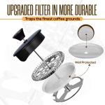 • SUPERIOR FILTRATION: A solid filtration system in a coffee maker ensures a refined taste and robust flavor mouthfeel. Our 4-filter sieve system has an improved piston plate and 80 mesh filter that extracts the earthy, rich taste of residue-free coffee. This 1000 ml/34 oz beaker makes 8 cups of creamier & tastier coffee.