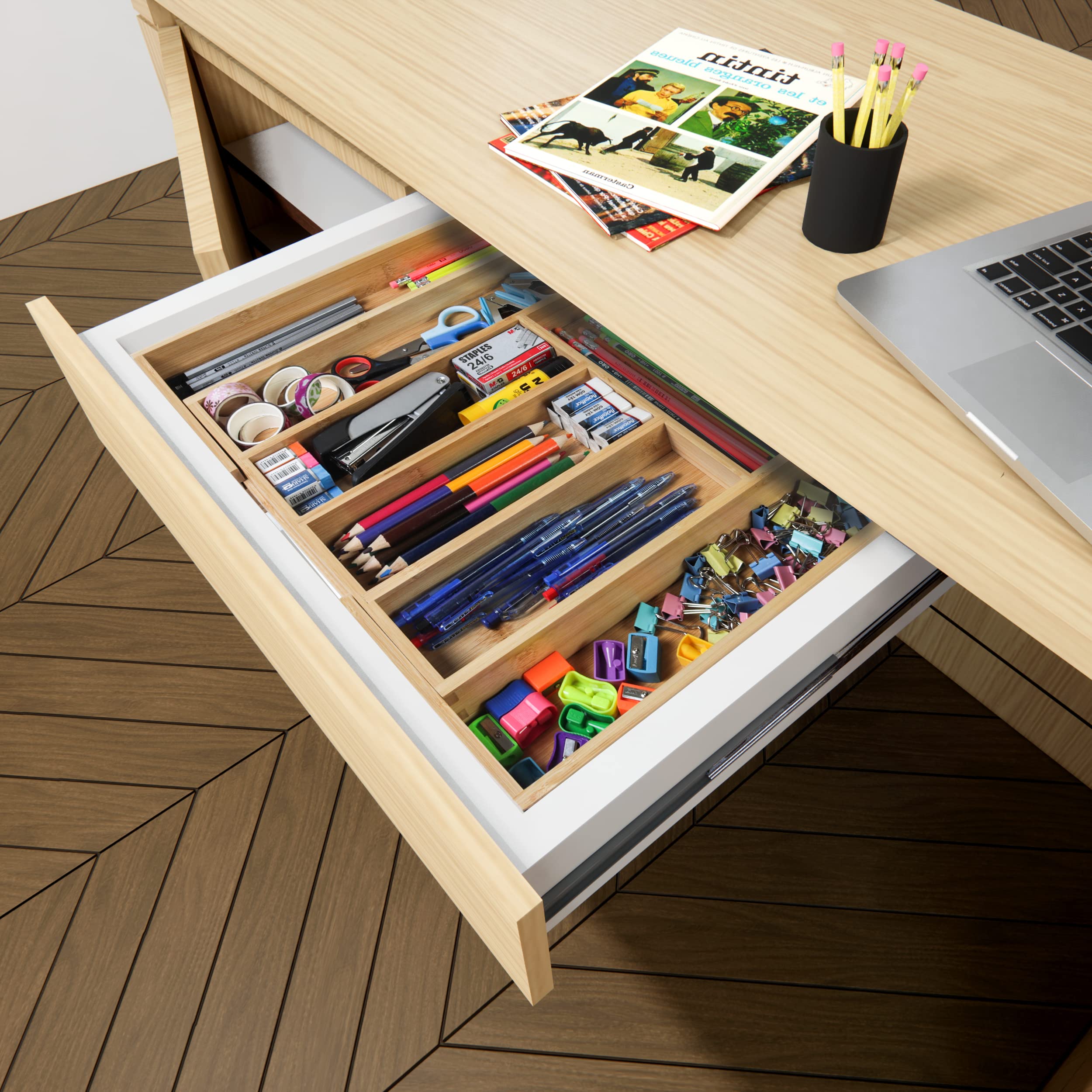 Add a contemporary look to your kitchen, garage, and office, with this Expandable Utility Drawer Organizer made with premium quality bamboo.